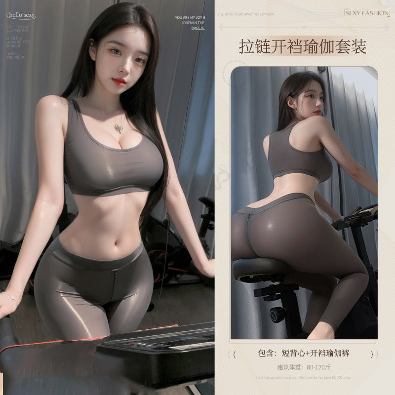 健身女神 灰色【短背心+开裆拉链瑜伽裤】