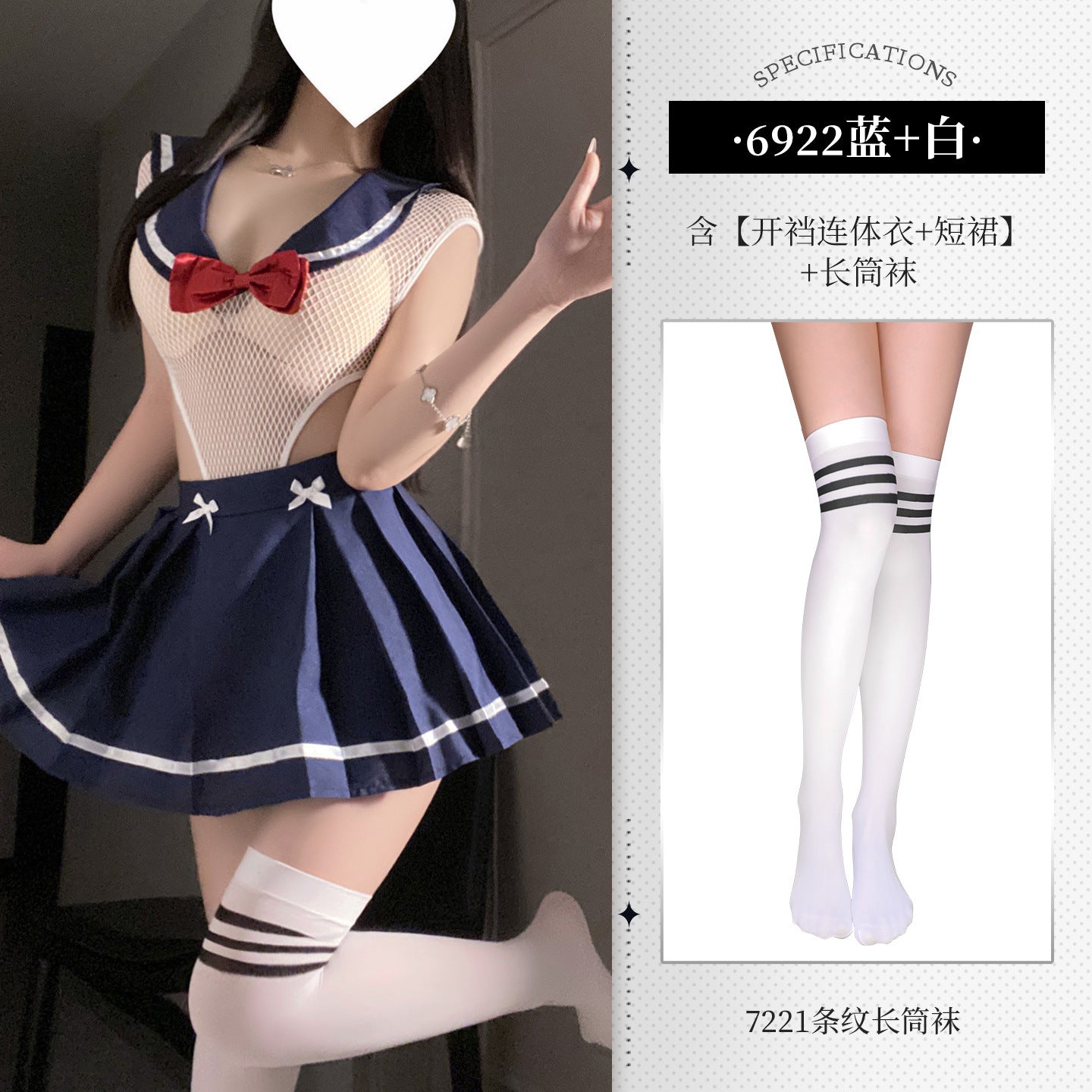 ◆双面JK◆蓝+白【开裆连体衣+短裙】+白长筒袜