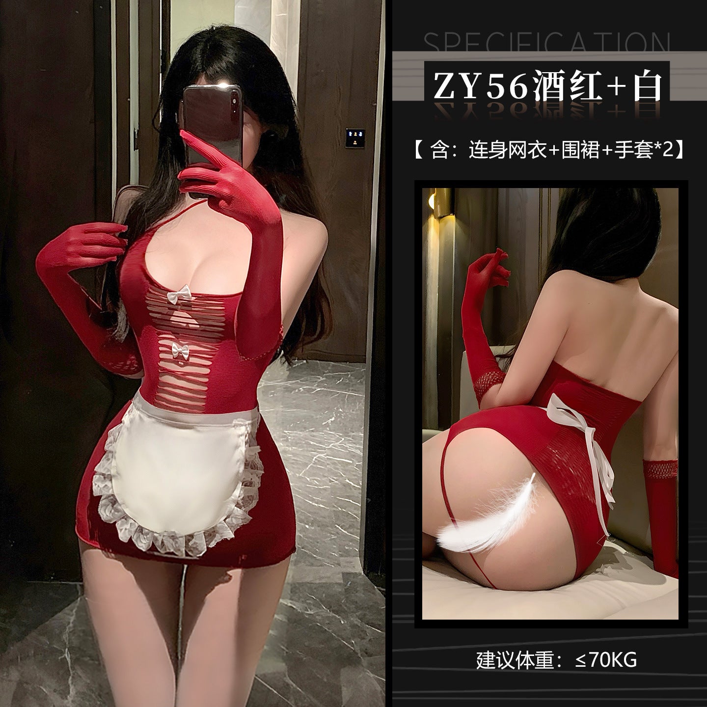 ◆娇俏女仆◆酒红+白【连身网衣+围裙+手套*2】