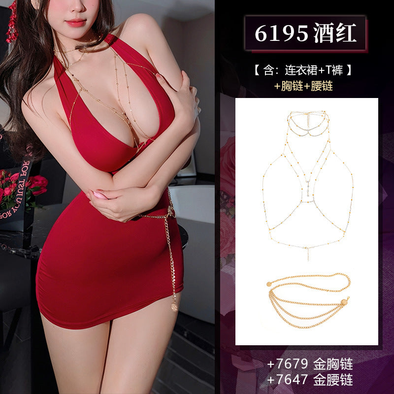 ◆情人密语◆酒红【连衣裙+T裤】+金色胸链+金色腰链