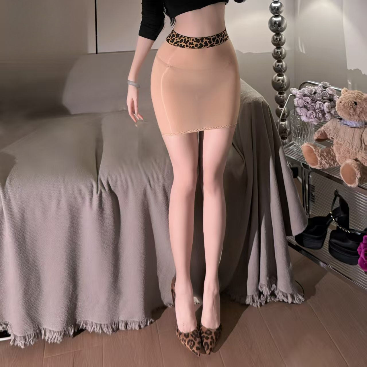 透视丝滑油亮豹纹马油包臀裙性感紧身短裙