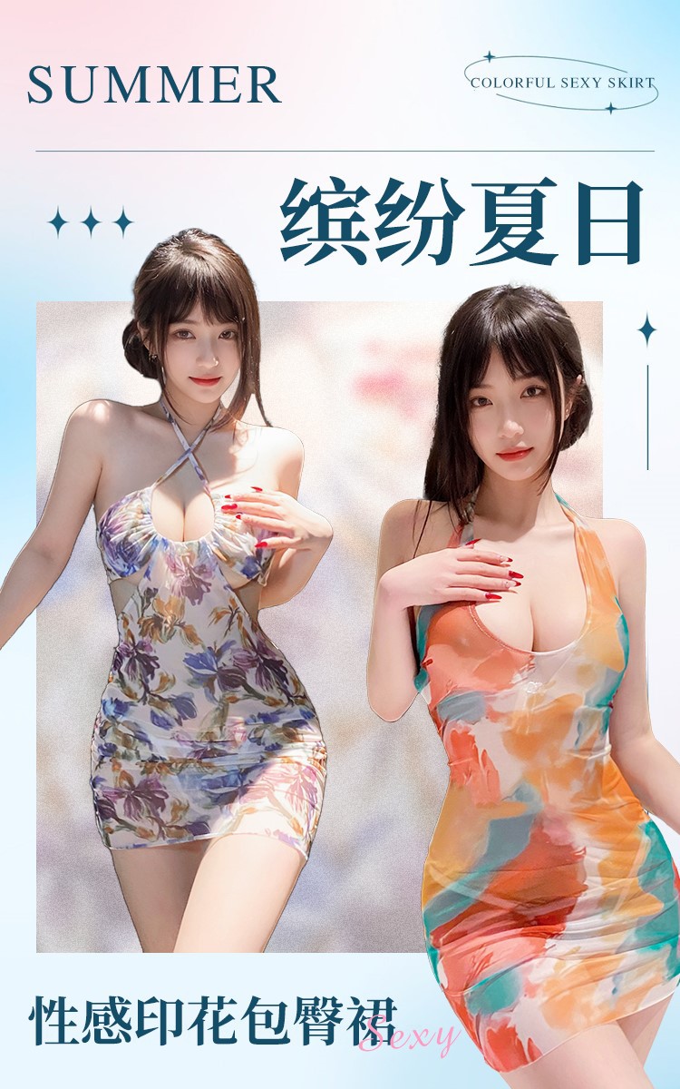 夏日氛围 深U露沟晕染印花包臀裙