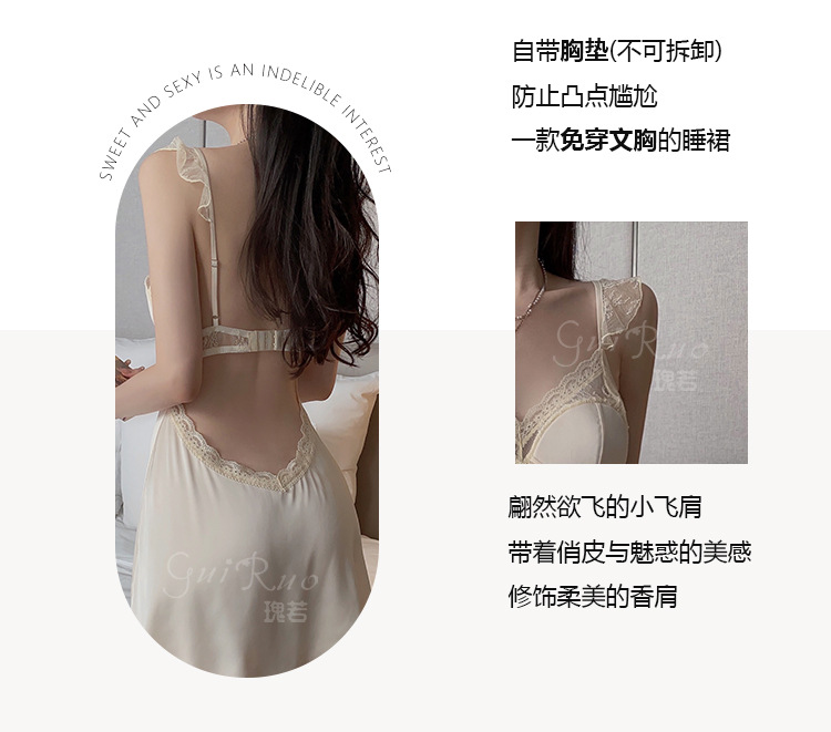温柔乡 缎面拼接蕾丝透视性感深V加胸垫吊带睡裙
