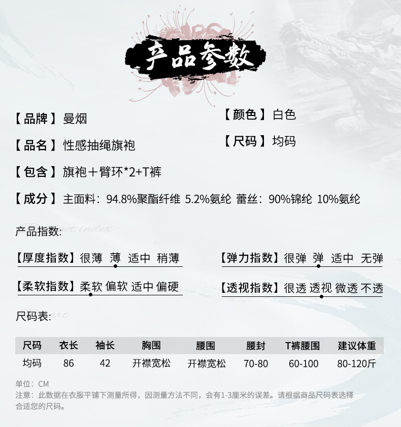 颜色:白色【旗袍+臂环*2+T裤】,本套装不包含模特丝袜,丝袜请在本店另购